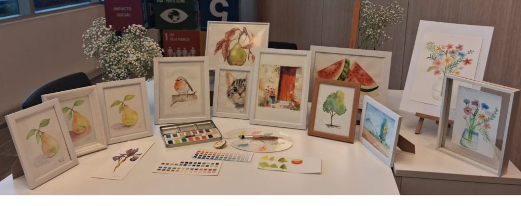 Durante las sesiones, que se extendieron hasta la primera semana de diciembre, las participantes aprendieron y desarrollaron la técnica de la acuarela junto a la profesora Sandra Cortés, aplicando progresivamente lo aprendido en sus primeros trabajos.