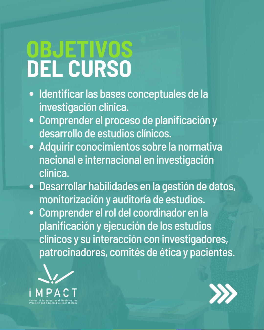Al finalizar, los participantes contarán con las competencias necesarias para desempeñarse como coordinadores/as de estudios clínicos, aportando al avance de la investigación y la medicina traslacional.