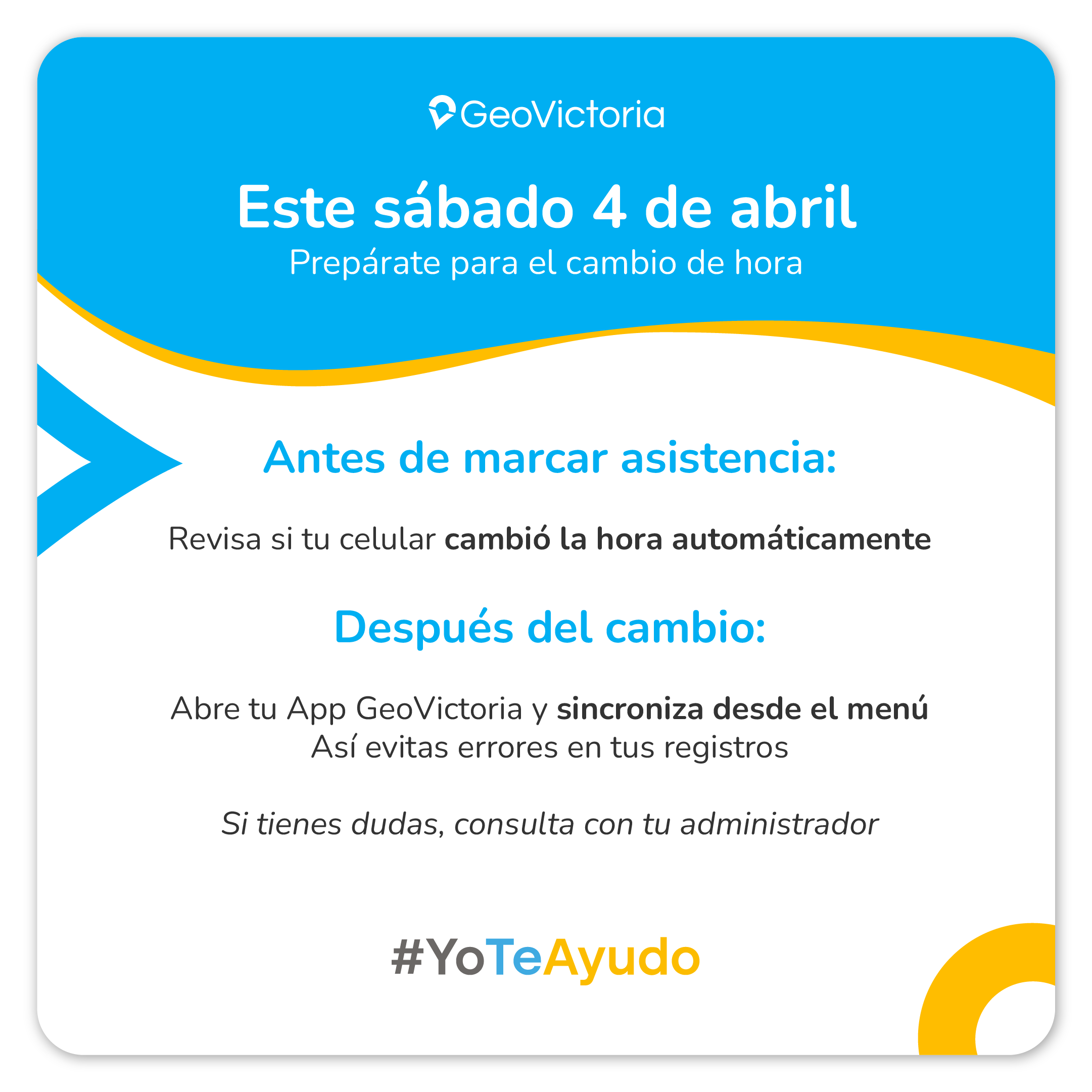 El sábado 4 de abril los relojes se atrasaron una hora para pasar al horario de invierno 2026 (UTC−04:00). Te recordamos revisar que tus equipos electrónicos -celular, computador, etc.- hayan aplicado correctamente el cambio de hora, para evitar llegar tarde, agendar erróneamente una cita o marcar tu asistencia en un horario equivocado en Geovictoria.