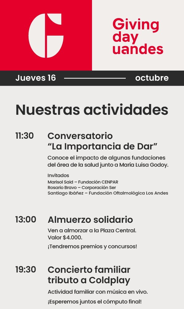 Otra forma de ayudar es comprando el merchandising de este evento, aportando a crear una cultura filantrópica y permanente en la Universidad, llevando la marca Giving Day Uandes en tu día a día. Conoce los productos y compra aquí.